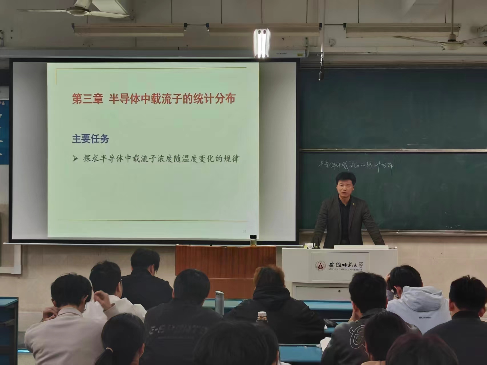 课程围绕"半导体中载流子的统计分布"这一核心内容展开,左则文从一个生活实例切入,介绍了一种基于占据概率的科学统计方法,为新课内容奠定理论基础。在讲授"导带电子浓度与价带空穴浓度"时,左则文严谨推导浓度积分表达式,由浅入深引导学生思考温度、掺杂对载流子浓度的影响,复杂概念辅以生活化比喻,使学生轻松突破理解难点。整堂课既展现了深厚的学术底蕴,又体现了以学生为中心的教学理念,理论深度与实践价值并重,为半导体物理课程教学提供了优秀范本。